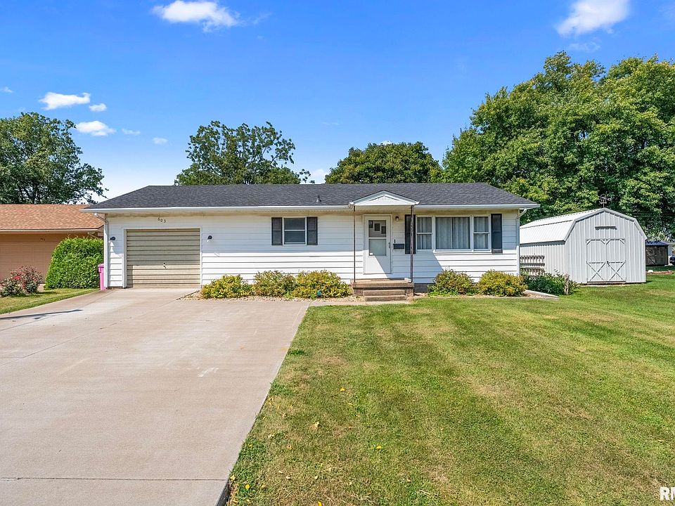 Get ready to fall in love with this home, ideally located just one block from the elementary and junior high schools in a vibrant small town bursting with community spirit! This gem offers the perfect blend of comfort, convenience, and low maintenance, making it an ideal spot for small-town living. Step inside to an inviting open-concept layout, where the kitchen and living room flow seamlessly together. Whether you're whipping up a meal or lounging with family, you'll always be part of the action. The kitchen is both functional and stylish, making it a joy to cook in, while the living room is the perfect spot to relax and unwind. This home features two cozy bedrooms and a newly remodeled bathroom that adds a touch of modern flair. The full basement offers endless possibilities, whether you"re envisioning a home gym, playroom, or entertainment area, the space is yours to customize. Plus, the pool table stays, making it a ready-made rec room! With ample storage throughout, including in the basement and the attached one-car garage, you'll have plenty of room for all your belongings. You will love the fresh concrete driveway that was expanded to add additional parking for your guests. The backyard is fully enclosed with a chain-link fence, creating a safe and private space for outdoor fun. Imagine summer barbecues or simply relaxing in your own outdoor oasis. roof 2024