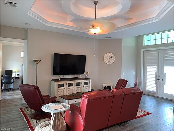 Nearly new (2018) Custom built Waterfront pool home. CBS construction, impact windows and doors, Generac whole house generator and video security system. This home features a SW Florida Coastal feel with Metal roof, Bahama shutters, shaker style garage door, and plantation shutters. 8' high shaker style interior doors, double french door in the master and an oversize lanai overlooking the large screened pool area. Pool is heated, 16 SEER air conditioning system. Porcelain plank tile, coffered ceilings, a wet bar and wine cooler, decorative pavers. This house is exceptional.
