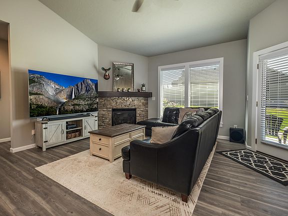 Gorgeous Paras built one level rancher located on a preferred corner lot. This lovely residence is in pristine condition & better than new construction. Upgrades are found throughout this great room design w/ vaulted ceilings, large beautiful windows accenting the grand living space. Quartz countertops & classic subway backsplash accent the kitchen, equipped w/ a huge 8’ island w/ custom cabinetry. The gas double oven will be a favorite of any chef. LVP flooring accents the living area. The primary suite is large w/ primary bathroom featuring quartz counters, LVT flooring & custom tiled mud set shower. Ceiling fans & cottage window treatments are just a few of the added amenities & added attention to detail. 4 plus car garage w/ work area is a plus. Backyard includes a wrap around covered patio, accented w/ many perennials, sprinkler system & vinyl fencing. The Eagle Ridge community features numerous parks, miles of walking trails, all to be explored right out your door. A must see home!