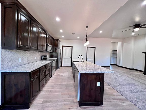 This adorable 1550 sq ft, 3-bedroom, 2 bathrooms with 2 car garage home is ready for a family to call its own. Custom cabinetry, granite countertops, Electric Fireplace, counter height breakfast bar and wood-look ceramic tile are just a few of the amenities you will find in this new construction that is just across the street from the Fletcher Park, Splash Pad and Baseball fields. This home has a huge walk-in pantry, large laundry room with lots of storage and folding space, a large entry closet and two closets in the primary bedroom. Take a look at the 3D tour then give Listing Broker, Debbie McDonald a call with any questions or to take a look! 580-695-8552.