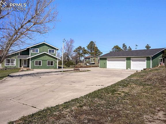 Welcome to Arrowhead ~ This 4 bedroom 3 bath home is nestled on 8+ fully usable acres with plenty of mature trees and pines for shade and shelter. This property has many uses with the private domestic well so bring your cattle, sheep and horses, as there are plenty of horse friendly amenities, including the riding arena, and an area for a larger riding arena if you choose. Multiple outbuildings line the property with versatile uses in addition to the oversized 3-car detached garage w/electricity and concrete flooring. Store your tractor or ATV's in the other outbuilding with a pull up door and keep the garage space for yourself. Country charm fills the interior, with beautiful wood inlayed accents and vaulted ceilings. Cozy up by the wood burning stove in the great room, leading to the dining area and kitchen that faces westerly ~ just imagine taking in these priceless mountain views daily. A generous main floor flex room/ bedroom has endless possibilities (office, studio, etc.) this room finishes out the main level of the home which is right by the laundry facilities, offering easy one-level living! The primary bedroom on the upper floor has its own walk out balcony also with those panoramic mountain views so sip your coffee while enjoying the wildlife that are abundant in the area. Experience serene country living just minutes away from Elizabeth amenities and a short drive to Castle Rock, Parker or Colorado Springs. And if thats not enough the owner installed Solar in 2021 with SunPower Equinox Solar - A powerful Complete Home Solar System that is paid in full!! *No HOA's *Private Domestic Well and a Septic System (No Water or Sewer Bill) *Fenced back area behind trees ~ Call today to set your time!