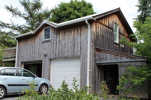 SOLAR! Country living feeling with privacy yet close to conveniences. Fully fenced yard, gardens and flagstone walkway, screened-in side porch, and wrap around front porch invite you to enjoy living here. 1st floor office/4th bedroom with pocket door and built-ins, palatial dining room, family room plus (with fun loft space!) situated next to eat-in kitchen. Hardwoods throughout, character and space galore. Detached garage with finished 2nd story for artist studio/apartment!