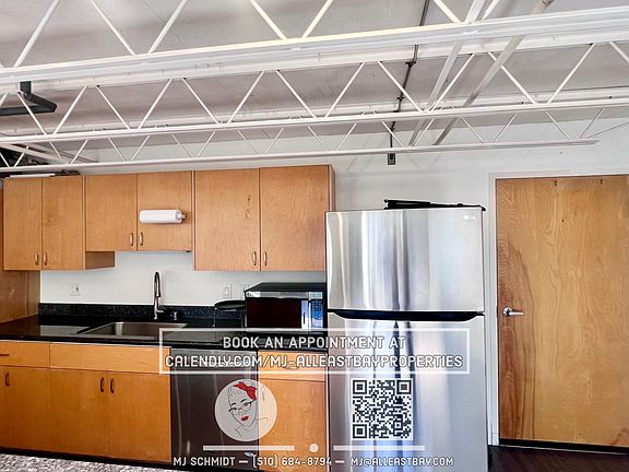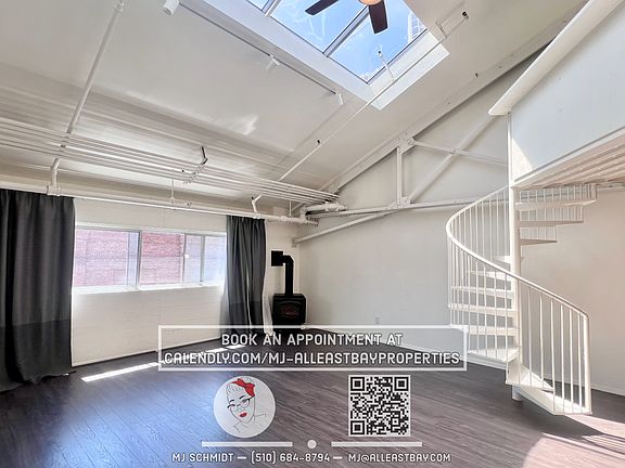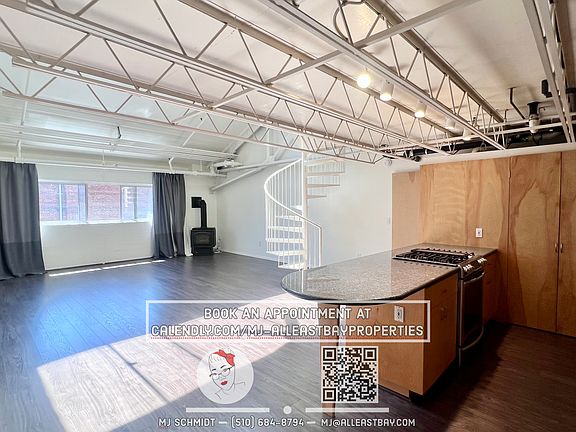 This contemporary loft-style property in Emeryville offers 1240 sq. ft. of living space across two floors. The interior showcases an open concept design with soaring ceilings and exposed structural elements, creating an airy, industrial-chic ambiance. The main living area features rich hardwood flooring and abundant natural light from large windows. A striking white spiral staircase serves as a focal point, connecting the two levels.The kitchen is a standout feature, boasting sleek wooden cabinetry in a warm honey tone, contrasting beautifully with stainless steel appliances. A curved granite countertop adds a touch of elegance and provides additional seating space. Modern amenities include a gas range, dishwasher, and a stacked washer and dryer unit. Throughout the space, recessed lighting and exposed duct work contribute to the loft's urban aesthetic. With its blend of modern conveniences and architectural interest, this property offers a unique living experience in a prime Emeryville location. Sales & Rental agent Maryanne "MJ" Schmidt DRE 02125244 All East Bay Properties Cal DRE# 01516255 *We are an Equal Opportunity Housing Provider and follow all fair housing laws.