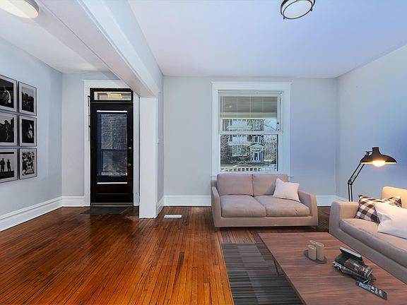 Three amply-sized bedrooms with great closet space, hardwood floors throughout, high ceilings, new windows, central AC & Heat