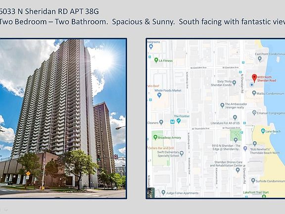This south-facing 38th-floor unit has over 1500 sq ft of living space with views of the lake to the South/East and city views to the South/West and lots of natural light. The unit has a large balcony extending the entire length of the unit and is accessible from the living area, as well as, both bedrooms. The inside features Grey Laminate flooring in the living area and carpeting in the bedrooms. The updated kitchen has Maple Cabinets, Granite Countertops and SS appliances and an assigned storage locker. The building has 24-hour doorman, Gym, Laundry Room, Tennis Court, Walking Path and Commissary, Pool/Sundeck overlooking the lake and Dog run area. Parking is available in the building for a fee. You are steps away from Whole Foods, LA Fitness, Many Restaurants to choose from, CTA 147 Express Bus to Downtown is right out your door as well as the Red Line Thorndale or Grandville stops. The unit includes basic cable and internet. Basic Cable and internet included. Tenant responsible for electric service.
