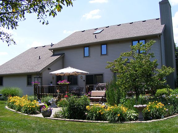 Spacious large rooms throughout the home. Living room, dining room, family room with gas fireplace and bookcases framing each side. Large eat in kitchen with dark oak cabinets, corion countertops, center island and computer desk. Large walk in pantry, full bath on first floor and spacious laundry room with cabinets, sink, folding counter and storage. Three large bedrooms on second floor, two spacious bathrooms and plenty of closets. Three car garage with cabinets, sink, floor drains and air compressor. Finished basement, three large rooms (one is ready for a potential 4th bedroom). Unfinished storage area with cabinets and second stairway that leads to the garage. Large deck with bench seating that overlooks the water garden and waterfall. A spectacular display of flowering trees and perennial flowers make up the landscape of this corner home.