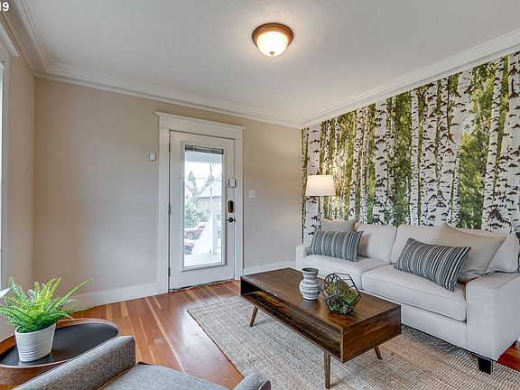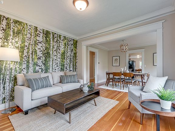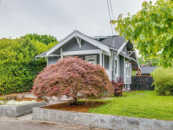 Hip Woodlawn Bungalow: stylish home a few blocks from the Dekum Triangle. Abundant natural light. Fir floors on main. Original crown molding and trim. Fresh ext. paint w/ fun front porch. Bold kitchen: black appliances + cabinets w/ breakfast nook & adjacent covered deck. Master bedroom up w/ walk-in closet. Unique media/family room downstairs. Fenced yard w/ covered hangout zone + huge detached shop! CHECK THE V-TOURS! [Home Energy Score = 3. HES Report at https://rpt.greenbuildingregistry.com/hes/OR10093863]