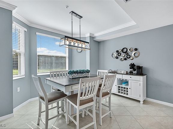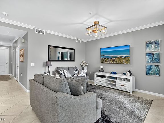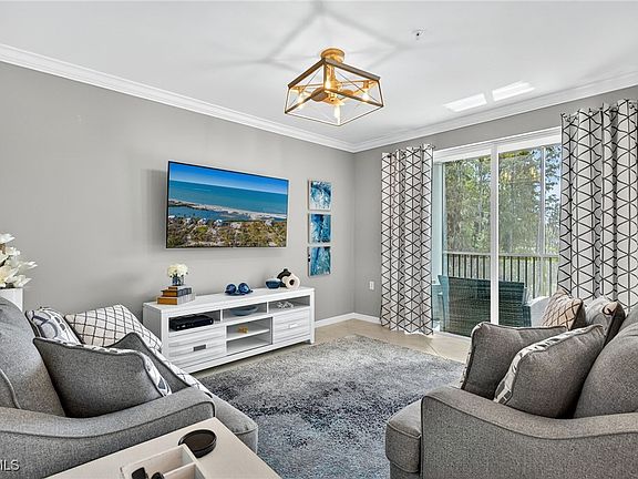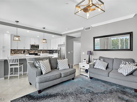 Welcome home! This terrace condo has the GOLF MEMBERSHP INCLUDED! Just bring yourself and your suitcase because this home is being sold furnished. This is known as the "Birkdale" layout. This model comes with 2 bedrooms, 2 bathrooms, about 1,200 square feet of living space, an exterior storage unit AND a 1-car covered parking space. Additionally, this unit is accessible by the stairs or the elevator. Walking inside and through the main hallway, you'll head right into your open kitchen which overlooks the living room and lanai. Finishes included in your main living spaces include everything from sleek quartz countertops with an oversized island, stainless steel appliances, crown molding, tile flooring, white cabinetry, beautifully updated backsplash and updated ceiling fixtures. With bay windows in the eat-in kitchen and sliding glass doors in the living room, you have the luxury of enjoying golf course & water views without even stepping outside! Back on the opposite (entry) side of the condo, you have your 2 spacious bedrooms and bathrooms. Your primary bedroom offers a large walk-in closet, linen closet, and a beautifully tiled walk-in shower while your guest bedroom has a closet and it's own nearby bathroom. It's meticulously maintained and it's move-in ready! Outside of your home and within the gates of The National Golf & CC, boasts an 18-hole championship golf course, a large resort-style pool, a Chickee Bar, 6 Har-Tru tennis courts, 8 pickleball courts, and 2 bocce ball courts. Living here means more than just residing—it's a vibrant lifestyle and experience. Outside of the gates, you can enjoy North & South Parks, a water park, Ave Maria University events, local dining, shopping and so much more! Come experience everything you need in the fastest growing area in Naples!