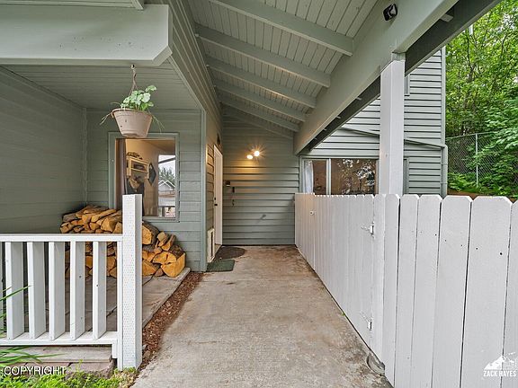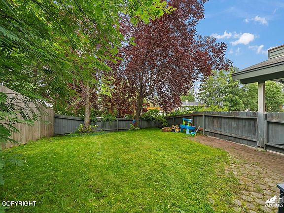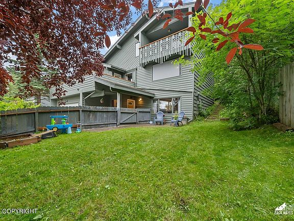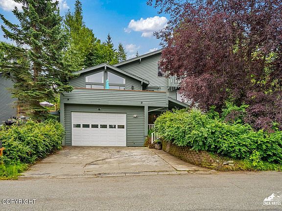 This spacious 3,032 sq ft. is a wooded oasis in the heart of Anchorage. The home is located on a quiet street with mature trees and foliage near JBER, playgrounds, schools, and amenities. Enjoy an open-concept kitchen with double ovens and stainless-steel appliances. The second-floor vaulted ceiling living room features plenty of windows, natural light, hardwood flooring, and ample deck. The home includes two primary bedrooms with ensuite bathrooms, one on the third level with a private deck, and one on the first level featuring a fireplace and wet bar, currently used as a multipurpose room. There is an extra-tall garage with an oversized door, offering plenty of room for storage and vehicles. Additional features include an on-demand water heater, sauna, large laundry room, and fenced-in private yard. This would be a wonderful place to call home! Home Warranty is included!