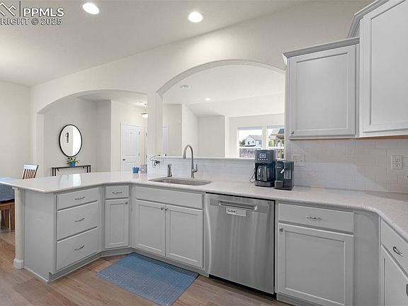Step into style and comfort with this nearly new end-unit townhome in highly sought-after Lorson Ranch. From the welcoming covered front porch to the charming patio and thoughtful landscaping, curb appeal comes standard. Inside, natural light pours through an open floorplan where durable vinyl plank flooring ties together the kitchen, dining, and living areas—perfect for everyday living or weekend entertaining. The kitchen shines with stainless steel appliances, granite countertops, a gas range, pantry, and abundant light gray cabinetry topped with crown molding. Just off the kitchen, the attached two-car garage with epoxy flooring adds both convenience and polish. Upstairs, three generously sized bedrooms each feature their own walk-in closet, while the oversized primary suite doubles as a private retreat with room for a sitting area or home office plus a beautifully finished en-suite bath. An upper-level laundry makes daily routines a breeze. Ideally located near Lizard Park, neighborhood green spaces, and just minutes from shopping and dining, this move-in ready home blends modern function with everyday ease.