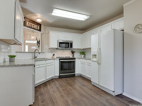 This welcoming brick home in a gated community offers outstanding curb appeal with a landscaped front yard and a covered entry. Inside, the living room features soaring ceilings, a fireplace, and wood-look flooring that extends through the main spaces. The open layout connects seamlessly to the dining area, creating an inviting setting for gatherings. A bright breakfast nook with bay windows overlooks the backyard, while the kitchen showcases white cabinetry, granite counters updated in 2021, a subway tile backsplash, and stainless steel appliances. The spacious primary suite is conveniently located on the main level and includes wood-look floors, a large window, and a private bath with dual vanities, a soaking tub, and a separate shower. Upstairs, a loft provides flexible living space ideal for a media room, game room, or home office. Two secondary bedrooms share a full bath and offer comfortable options for family, guests, or hobbies. Step outside to enjoy a backyard with a patio and plenty of room for outdoor activities. Recent updates add peace of mind, including a new roof, garage door, and fresh exterior paint in 2025, plus a water heater replaced in 2024. This move-in-ready home blends comfort and thoughtful updates with a prime location close to the Medical Center, UTSA, La Cantera, and convenient access to downtown. Please be aware some photos have been virtually staged.