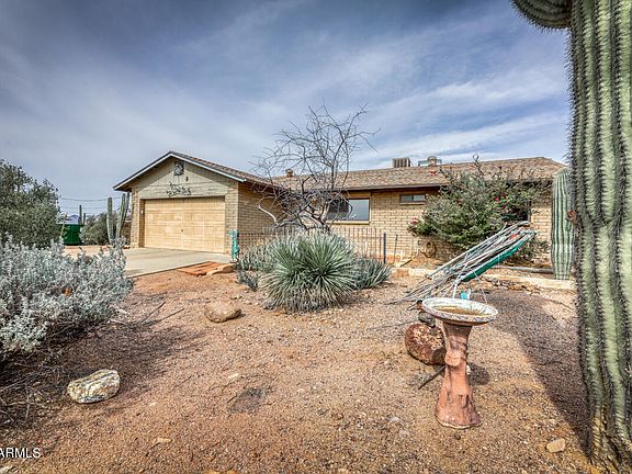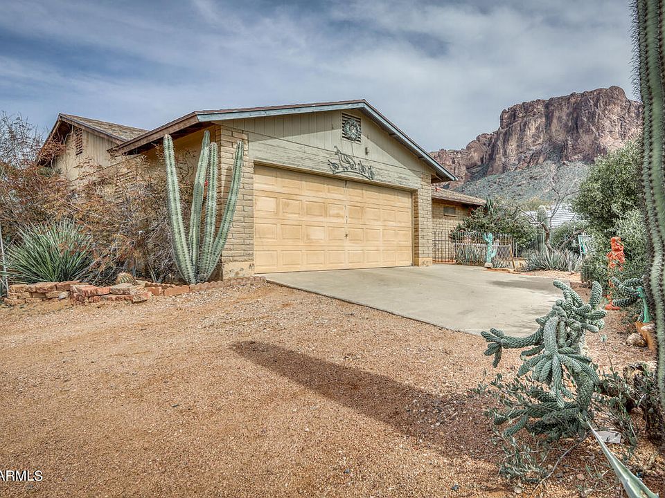 The Superstition Mountains become close up and personal from this home situated on a fully fenced 1.25 acre lot. Approximately 1300 square feet, two bedrooms, two bathrooms, office area and large Arizona room. Efficient block construction with two car attached garage and detached 24x24 garage/workshop. Plenty of space for horses and all your toys. Wonderful location with hiking and biking trails at your door.