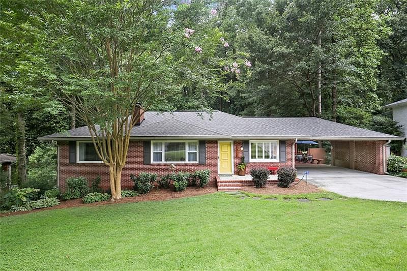 Pristine ranch on a basement in the heart of Sandy Springs! This four sided brick gem in a fabulous location is impeccably maintained and refreshed. The cheerful sunshine-colored front door sets the mood as you step into this captivating home. Natural light floods the large open great room which shares center stage with the dining room. A breakfast bar separates the kitchen from the dining area. Groceries and little ones are easy to transport from car to kitchen in a few short steps. Just beyond the spotless carport is a fabulous deck with space to dine, relax, grill and entertain. Three spacious bedrooms complete the main level with bathrooms that have both been refreshed. The secondary bedrooms and closets are larger than most. Downstairs you will find a huge, bright bonus room with extra storage. This flexible space is large enough for multi-purposes. The exterior door leads to a wonderful patio complete with a large stone fireplace for outdoor entertaining and s'more fun! A huge unfinished portion of the basement provides ample space currently for a workshop, work out area and TONS of storage. The level landscaped lot is mature and private. So many updates - refinished hardwood floors, new driveway and carport pad, irrigation system, roof, exterior paint, gutters, gutter guards, interior doors, windows, fenced backyard, NEST thermostat, utility shed, and more! Optional Hammond Hills Swim and Tennis membership, walk to stores, restaurants, the library and City Springs.