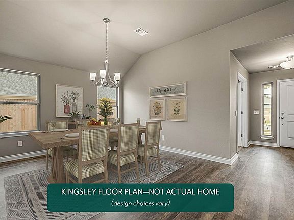 This home has it all! The Kingsley features a private home office, formal dining area that can be used as flex space, as well as a large open living area. This spacious home features a chefs' kitchen with a huge island and a considerable amount of storage space as well as quartz countertops and a gas range. The main living area includes luxury vinyl plank flooring and a fireplace. With an included covered patio, this home is sure to please. The Canyons is a wonderful community with convenient access to Oklahoma State University and downtown Stillwater. Residents love the fishing pond, walking trails, playground, wooded areas, and plenty of green space to play. Included features: * Two-year home warranty * 10-year structural warranty * Guaranteed heating and cooling costs * Fully landscaped front & backyard * Fully fenced backyard. Floorplan may differ slightly from completed home.