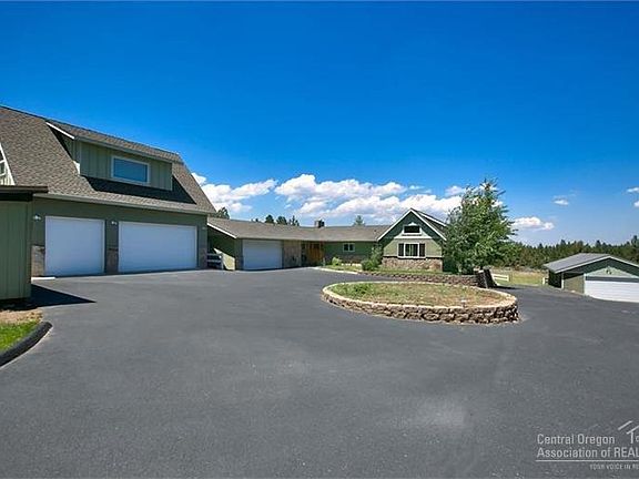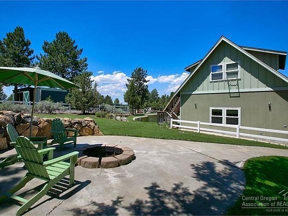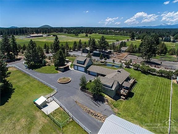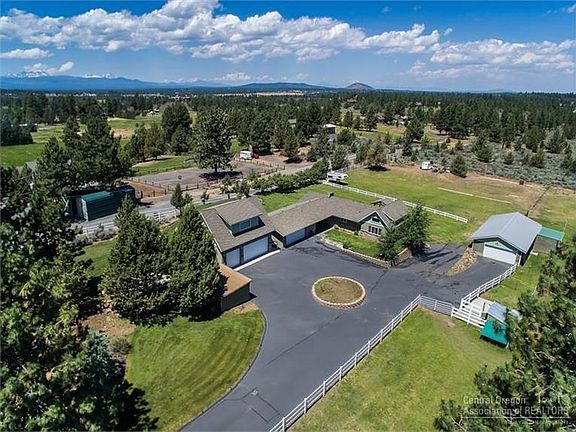 Stunning acreage property in SE Bend with shop, barn, guest quarters, and 7 car garage! Beautiful lush setting with mature pines with over 5 acres of turn key underground irrigation, vinyl fencing with gated access, paved circular driveway, fire pit area, concrete lined pond, and multiple outbuildings. Main home is single level, with gas fireplace, updated kitchen, vaulted master suite with gas fireplace & large deck and patio. Detached 3 car garage has spacious suite with great Cascade Mountain views.