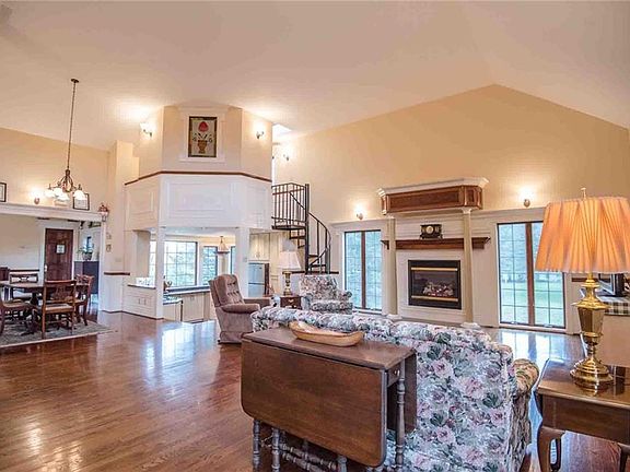 ONE-OF-A-KIND Carriage House w/ sweeping farmland views! Spectacular architectural details incl vaulted ceilings, skylights + columns. Grand floor plan featuring the open concept living space, a lofted office with a ½ bath & main level bedroom currently functioning as a den w/ new gas stove and walk to patio. Entire home is heated w/ HIGHLY EFFICIENT radiant floor heating, incl both garages! A unique & special MUST SEE property! Square footage per owner is 2,200..