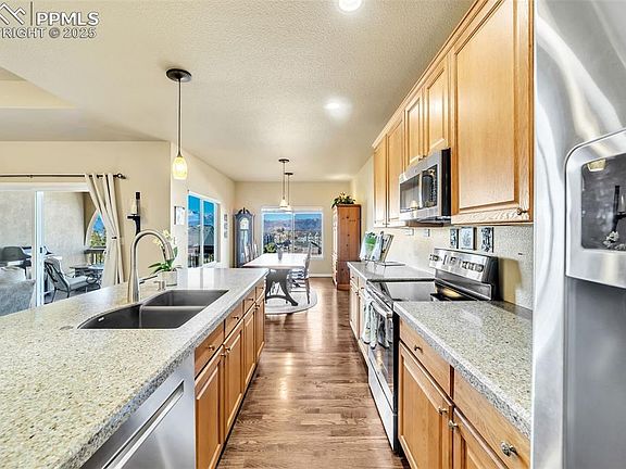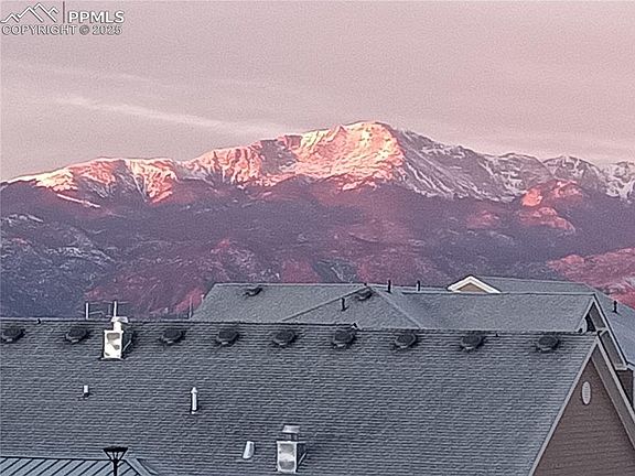 Wake up to breathtaking, unobstructed views of Pikes Peak and the Front Range from this immaculate 5-bedroom, 3-bath ranch-style home with a walk-out basement. Nestled in sought-after Cumbre Vista, this Energy Star-certified Keller home offers quality construction, a spacious 3-car garage, and an open-concept design maximizing comfort and scenery. The main level is designed for effortless living and entertaining, featuring a bright, open floor plan with hardwood floors, a cozy fireplace, and a tray ceiling in the living room. The well-appointed kitchen flows seamlessly into the dining area and out to the low-maintenance covered deck, perfectly framing the stunning mountain views. The primary suite is a peaceful retreat with breathtaking vistas, a large walk-in closet, and a tranquil ensuite with a custom shower and dual sinks. The ideal floorplan includes two additional bedrooms (one used as an office), a separate laundry room, and another full bath on the main level. Downstairs, the walk-out basement offers equally stunning views and incredible additional living space—yes, even from the basement! It includes a fully equipped kitchenette with a refrigerator, solid surface countertops, a microwave, and a dishwasher, ideal for entertaining or multi-generational living. Walk out to your private, luxurious spa! Relax under the stars in the like-new hot tub on the covered patio in the fully fenced backyard. The lower level also features two spacious bedrooms—one with a big walk-in closet, the other with Peak views. A full bath sits between them. The unfinished area is large enough for a hobby room, workshop, or extra storage. Located in highly rated School District 20, this home is just minutes from hospitals, shopping, and all essential amenities. Meticulously maintained and move-in ready, this home blends breathtaking scenery, main-level living, and flexible space to fit any lifestyle.