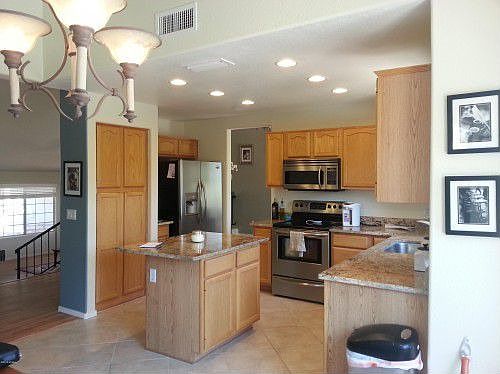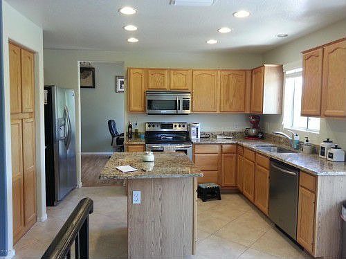 Wonderful 4 bedroom, 3 bathroom, 3 car garage home in Pinnacle Hill. This home has been upgraded throughout. A great oversized backyard, new pebble tec pool, raised garden, 8 citrus trees, 2 peach trees and 1 fig tree. Great backyard for a family or just to entertain. Mountain views in front and back yard. House is on cul-de-sac lot at the end of community for privacy. 3-level home with open floor plan, vaulted ceilings, upgraded wood laminate, tile and carpet flooring. Granite counter tops, SS appliances and recessed lighting. One bedroom / bathroom is on 1st floor making for a great guest quarters. Three other bedrooms and 2 bathrooms are upstairs. Amazing views of the mountains from the front and backyard.