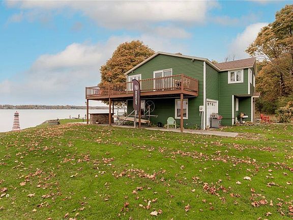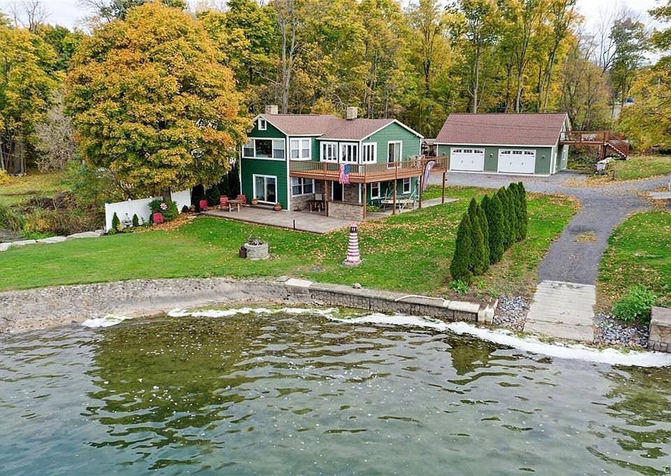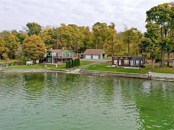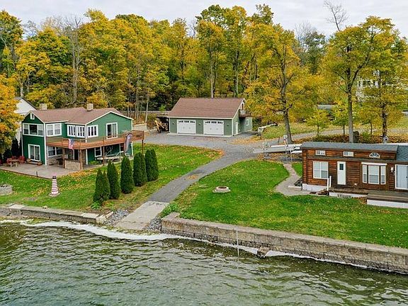 Come live your best life at this multi property Finger Lake paradise w/ 220 ft of lakefront, 125 ft dock, and 2 new boats included! Enjoy exploring via the Erie Canal and/or Seneca River connections. Main house has rustic charm, wood burning fireplace, sliders to back patio, have your morning coffee or a glass of wine & watch beautiful sunsets, 2nd floor includes 3 bdrms (one currently being used as family room w/ wet bar), sliders to deck. Expansive 30 X 40 ft insulated 4 car garage, w/ electric can be used as workshop, perfect for storing all your toys. Above garage apt includes large living room, bedroom, & full bthrm, separate deck for enjoying the views. Are you a wine-lover? Here's your chance to own your own vineyard, 1/3 acre lot typically produces one ton of white grapes. Current owners sell grapes to local White Barn Vineyard. Second lot at 6037 includes log cabin trailer that sleeps 10, eat-in kitchen, living room w/ privacy door converts space to more sleeping quarters, plus 1st floor bdrm and loft. It gets better... properties are on public water & sewer. Plenty of room for large/multiple families, AirBnB business potential, or make this your retirement home.