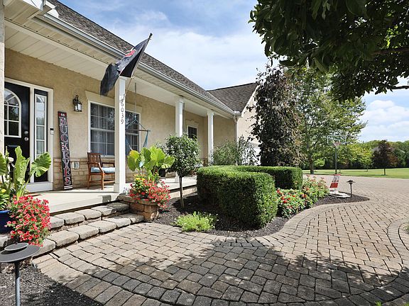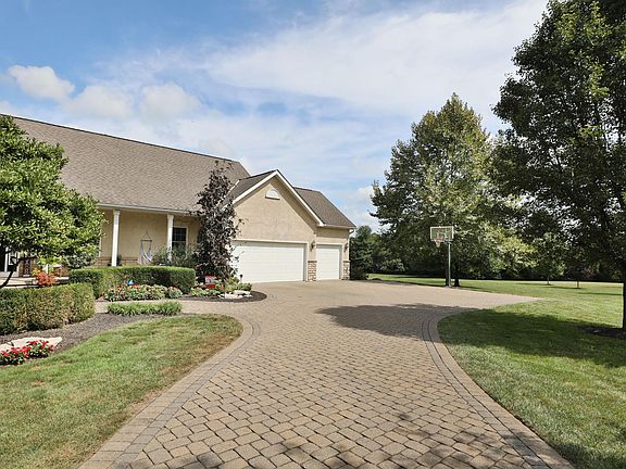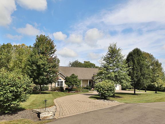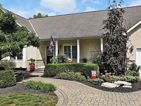 Custom built stone/stucco RANCH wt 3 beds, 3.5 baths on 1.5 tree lined acres wt 3 car garage, front porch- just north of Dublin! New LVP on first floor+ fresh paint. Dining room+ vaulted Great room-perfect for entertaining, wt sitting room/office off the great room. The open kitchen has eating bar, stainless appliances +eating area. Covered back porch off of kitchen. Laundry off the kitchen wt sink+garage access. Primary bedroom wt private bath has soaking tub + shower. Shared full bath off two guest bedrooms. Powder room off the hallway. Lower level media room has LVP flooring, full bath, kitchen wt two beverage coolers, sink, stove, tons of cabinets and counter space/wired for projector Three other finished rooms in lower level-plus storage. Elegant paver driveway and lush landscaping