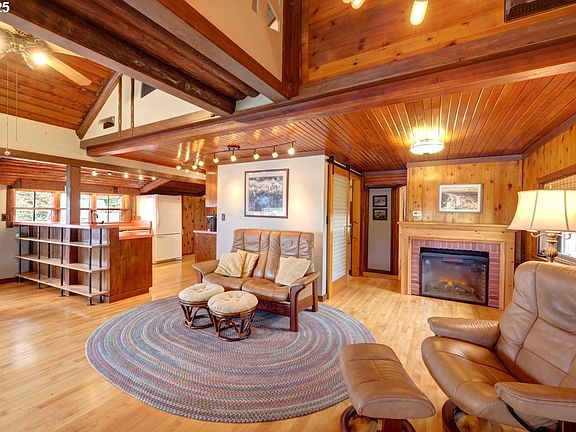 Discover this charming 1928 cottage nestled along the scenic Necanium River in Seaside. This enchanting 2-bedroom, 1-bathroom retreat boasts delightful knotty pine walls and stunning refurbished school gym maple floors. Experience the soothing ocean sounds from a rear dock and upper patio on the west side of the house. Enjoy fishing and easy loading for kayaks and other toys into the water. Take in nature's beauty with a lovely garden and lush treed surroundings. A gardening shed and a tool shed are conveniently located on the East side of the house for easy and accessible storage. This storybook home is a coastal gem!