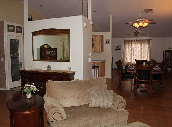 This well-kept home has only had one owner shows pride of ownership! Split bedroom design with open concept living areas. The formal dining room, separate living room and family room, along with the tall ceilings and built-in plant shelves make it light and bright. The open kitchen has a huge pantry and skyline cabinetry design; the island and pot rack stay! The master suite is quite impressive in size and has room for a sitting area/office area and his and hers closets allow for plenty of storage space. There are double sinks in the master bathroom as well as in the guest bathroom. The huge covered patio out back is great for entertaining in any weather and the low maintenance, privacy yard makes it easy to lock and leave with peace of mind. A few other amenities include 2 evap coolers, a large capacity furnace,3 car garage and all appliances are included!