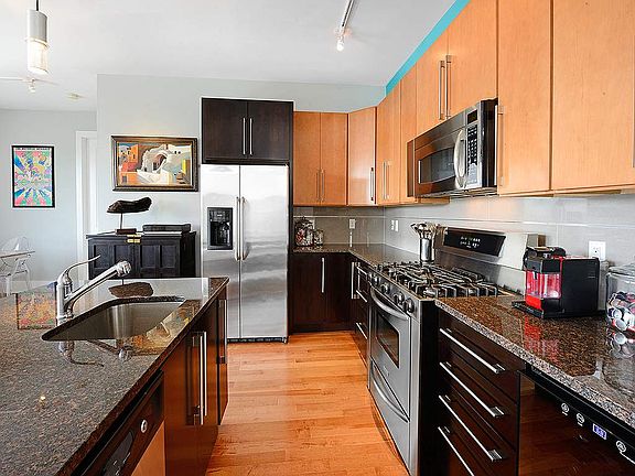 Exceptional Location-Spectacular Top Floor Residence! Fabulously appointed 2 bed/2 bath home features a chef's kitchen w/custom cabinetry, granite counters, S/S appliances and tile backsplash. Living/dining area boasts high ceilings, hardwood floors, custom lighting and over-sized sliders leading to your expansive private 500s/f roof terrace! King sized master bedroom features an abundance of closet space and an en-suite bathroom w/steam shower. Elevator, deeded parking & storage make this the perfect home!