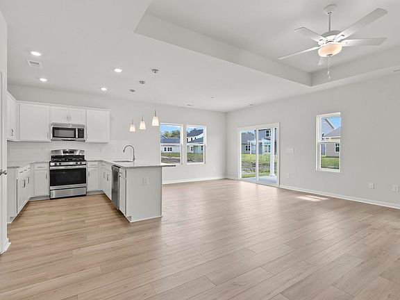 The Durham is a split floor plan with three bedrooms and two bathrooms. Two identical guest bedrooms are situated at the front of the home and share a full bath located in the main hallway. The kitchen offers upgraded white cabinets, granite countertops, tile backsplash, and pendant lighting. An expansive kitchen peninsula overlooks the great room and eat-in area while hosting enough seating for up to five! Luxury vinyl plank flooring extends throughout the entire home. A covered porch out back creates a nice outdoor entertaining area. The primary suite is located at the back of the home and features a spacious walk-in closet. The en-suite bathroom includes a double vanity with quartz countertop and a five-foot tile shower with glass enclosure. Additional options include bench and cubbies upon garage entry, irrigation, garage door opener, and architectural shingles. Amenities include a pool and cabana area. Merrill Villas is in the heart of Carolina Forest offering convenient access to amazing shopping, restaurants, championship golf courses, Myrtle Beach International Airport, and is less than five miles to the beach! *Photos are of a completed home for reference only*