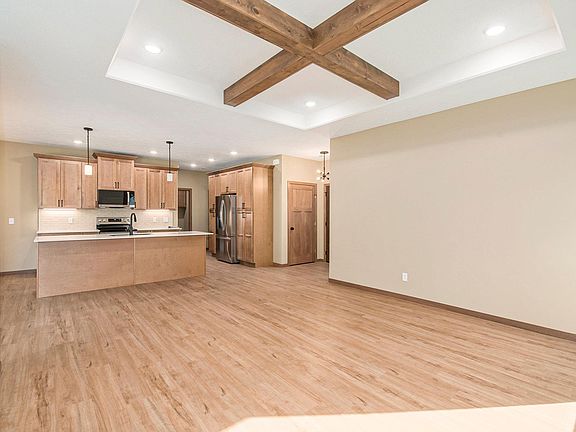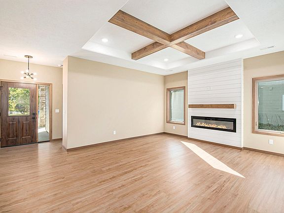 Welcome to the Retreat by Glammeier Homes! This brand-new slab-on-grade residence offers 2 bedrooms, 2 baths, and a bright open floor plan with thoughtful design throughout. The primary suite includes a walk-in closet and private ¾ bath with a double vanity, while the second bedroom and full bath provide comfort for family or guests. The living room showcases a striking fireplace feature wall and a tray ceiling with wood cross-beam accent, while the dining area flows seamlessly into the inviting sunroom with access to the backyard patio. Warm wood tones and neutral wall colors pair beautifully with luxury vinyl plank flooring for a timeless feel. The kitchen is a showpiece with its center island, quartz countertops, tiled backsplash, and stainless steel appliances. Outdoors, enjoy a covered front porch, backyard patio, new sod, and a sprinkler system already in place. A finished triple-stall garage with water hookup adds convenience and storage. A perfect blend of modern finishes and everyday comfort. This home was designed for easy living in style!
