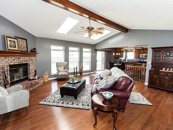 Pride of ownership shines in sought after Keystone Crossing Subdivision! Gorgeous vaulted great room ranch w/ 3 car oversize garage! Nicely landscaped w/ window boxes & covered front porch! Leaded glass entry door that opens to an entry foyer w/ architectural columns that flows into the vaulted great room w/ skylights, wall of windows w/ leaded glass transoms, corner wood burning fireplace & updated laminate wood floors! Dine & entertain w/ ease-wonderful open dining area w/ slider to patio for outdoor barbecues & adjoining kitchen w/ 42" cabinetry & newer stainless appliances including gas stove! Convenient main floor laundry! Luxury master suite w/ french doors, walk-in closet, double bowl vanity, jet tub w/ stained glass window & separate shower! Fresh interior paint & new carpet! Fenced back yard w/ custom built 11 x 9 storage shed & patio! Open staircase to lower level w/ large built-in work bench & newer half bath! Roof only 2 years old & low maintenance exterior w/ vinyl siding!