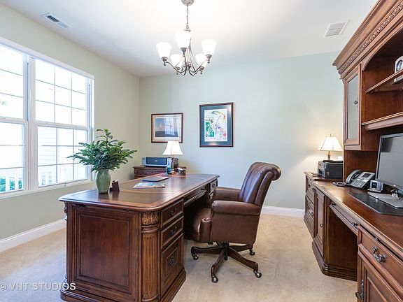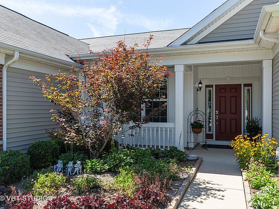 Rare "Washington" model (5 yrs. new) on a premium lot and quiet cul-de-sac with no homes behind.This home has 3 Bedrooms & 3 Baths Plus Den! Open floor plan with hardwood flooring, Great Room with 11' ceilings, built-in speakers, customized added wall with bookshelves. Gourmet kitchen with huge island with granite counters, backsplash, under cabinet lighting, can & pendant lights, Jenn Air SS Appliance pkg, upgraded cabinet pkg. with maple square glaze, microwave with exterior venting & beautiful hood over cook-top. There is seating at Island (chairs excluded). Finished Garden/Game Room behind Great Room. 3 bedroom and den has new Masland carpeting. Master Bdrm has tray ceiling, bay window, and huge walk-in closet with add'l.shelving. Master Bath has been customized after closing to a 45x8 tile shower with bench. Hunter-Douglas custom window treatments throughout. Bdrm.3 has built-in twin Murphy beds. Solid Core doors, tankless HWH, tile Flrs.in baths & laundry. Dedicated 220 outlet. Inground sprinklers, arched doorways, 5" baseboards, 3 ceiling fans, brick paver patio (470 sq.ft), finished garage painted & insulated and has something very special: 8'x16'x6' high finished storage space above garage with pull-down stairs + HEATED & AIR CONDITIONED, + ELECTRIC LIFT WITH A 250 LB.CAPACITY TO BRING YOUR ITEMS UP WITHOUT CARRYING THEM! Edgewater by Del Webb is an over 55+ community. Edgewater takes care of grass maintenance and snow removal, is a gated 24/7 community, and has an indoor and outdoor pool, fitness center, etc. at Creekside Lodge. Additional Info section has Covid Disclosure and Additional Feature Sheet. (Some furniture will be for sale)* *Please note RE taxes do NOT have a Homeowners or Sr.Exemption-Assessor said with those 2 exemptions taxes would be approximately $1100 less**