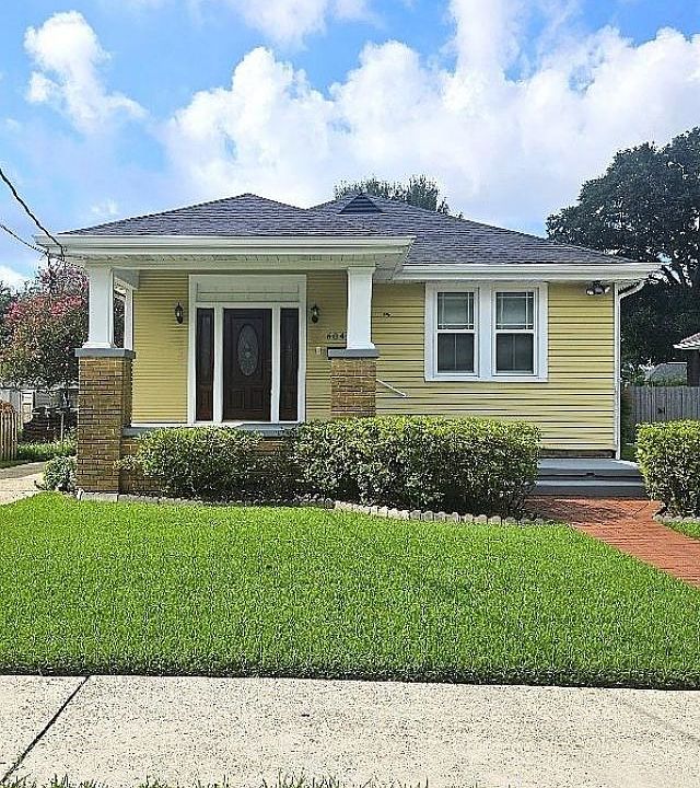 Wonderful location for a charming raised Cottage with covered front porch and TWO DRIVEWAYS, one on each side of the home, holding a minimum of 3 vehicles each. Covered carport and single car garage. Think Mardi Gras! Leaded glass and stained wood door with sidelights complement vintage dcor period details. Living and Dining Room with original refinished hard wood floors adjoin. Dining Room recessed storage under double windows. The ornate brick fireplace adds rich historical decorative accent with original iron stamped surround and ornate grill, along with a built-in china cabinet. The spacious kitchen has room for many cooks. Clean and pristine in white, fully equipped with appliances, including a gas range/oven, with another built-in cabinet with upper glass cabinet doors. Daylight streams into this space with three windows! Off the Kitchen is the Sunroom/Den with a wall of windows, with a door leading to back yard and covered patio. The Bathroom has original vintage white tile floors and a walk-in shower with built-in seat. Two ample-sized two bedrooms, one with two, one with four windows, plus ceiling fans. Window blinds throughout the home. A grand scale yard with a covered carport and one car garage includes a generous storage area that could be a workshop. Manicured landscaping front and back with lawn maintenance provided by Owner. Regular termite control and AC service checks. Tenant pays all utilities monthly, except water ever other month. No pets or smoking. Enjoy sitting on your front porch, or recreating in the back yard, cooking with friends, or planting a garden, this home has something for everyone. Only minutes to everywhere via I-10 and seconds to major throughway streets and drug stores, groceries, restaurants, schools, places of worship, shopping, this home delivers the best of living with the best comfort of home. Look no further, you've found where you need to be!