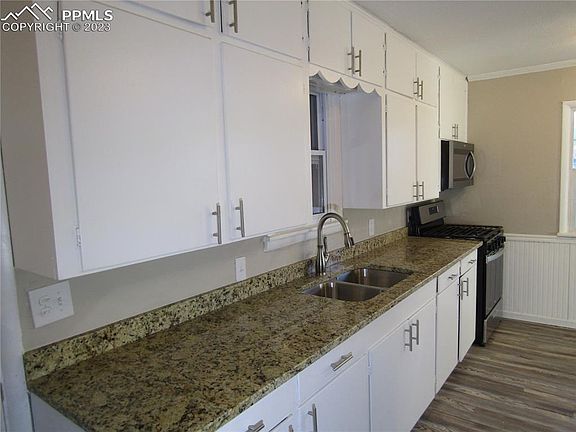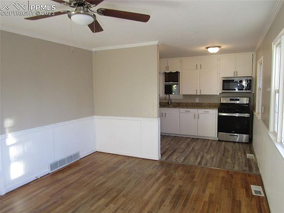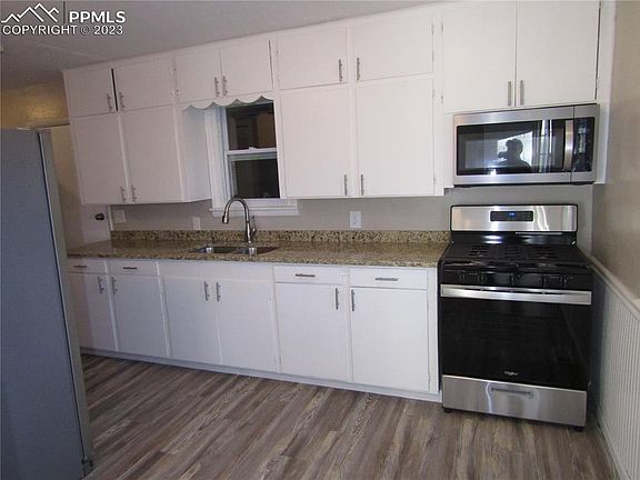 Welcome to this charming 3-bedroom, 1-Bath home with a 1-car garage. Step inside to discover freshly painted interiors, complemented by newly refinished wood flooring that adds warmth and character throughout. The kitchen boasts new stainless steel appliances and elegant granite countertops. The bathroom features new shower tile and shower fixtures, enhancing both style and functionality. Outside, the residence exudes curb appeal with it's newly painted exterior and a brand-new driveway leading to the garage, equipped with a new garage door opener. Step outside into the expansive backyard where generous space awaits for entertaining guests. Conveniently located near schools and easy access to I-25 and Fort Carson.