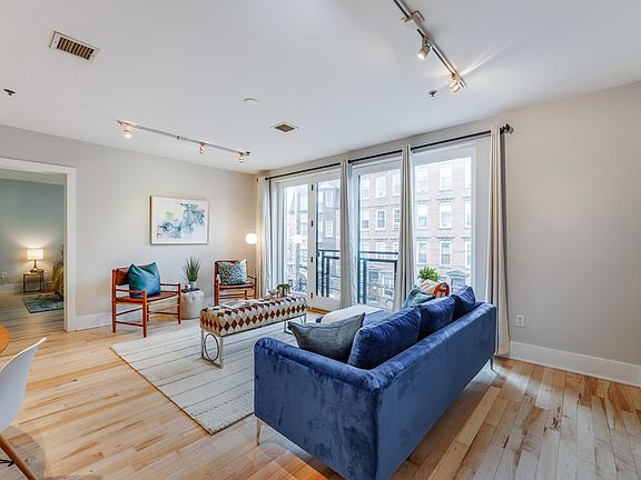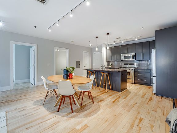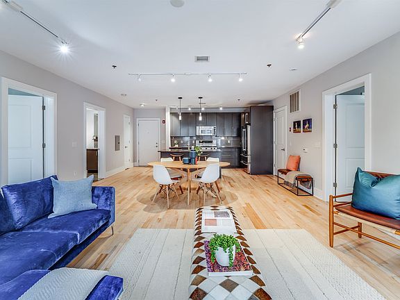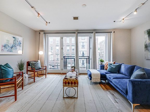 Welcome home to this beautiful 1351 square foot 2 bedroom/2 bathroom condo with deeded parking with an elevator. A chef’s kitchen with a large center island, granite countertops with breakfast bar, stainless steel appliances, and wine fridge opens up to an oversized living/dining room area flooded with natural light through ceiling to floor wall windows and Juliet balcony. Generously sized bedrooms feature bay windows and tons of closet space. Impressive master bath includes granite double vanity, frameless glass shower and separate tub. Crown molding and beautiful hardwood floors throughout. Unit includes central A/C and washer/dryer. Recently renovated common yard. Conveniently located close to parks, shops, dining, and transportation into NYC.