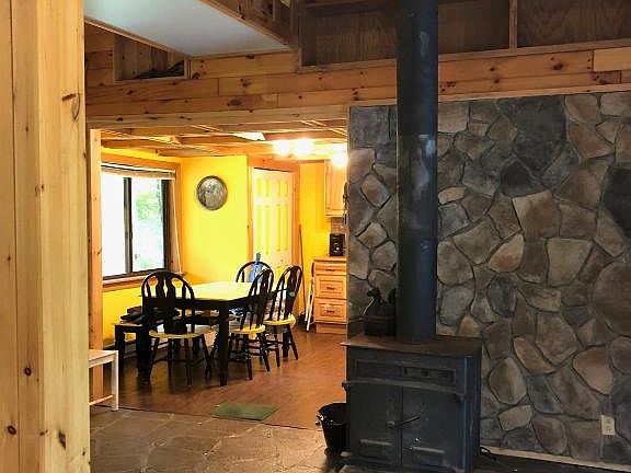 NESTLED AMONGST THE TREES...Is where this charming log sided cabin sits! Completely remodeled over the years by the owner, who himself is a Master Carpenter! The attention to details are evident throughout! From the hand laid stone floors with stone the owner picked from a local quarry, the custom built-in oak bookshelves, the tongue & groove ceilings and the one of a kind carved loft balusters. The Wood Stove with a beautiful stone backdrop (done by the owner as well!) warms the cabin completely but if you won't be home to "stoke the fire" you do have electric heat as your back up. The Eat-in-Kitchen has been remodeled as well within the last four years with new cabinets, countertops & appliances, You also have a conveniently located stackable washer & dryer hidden away in the kitchen. Walk from the loft style bedroom (or office/hang out) across the catwalk which is lined with those one of a kind balusters, to the main bedroom. Situated on 2+/- acres that have two small ponds. This is a must see to appreciate all the well thought out and loving executed details! Under 3 Hours from NYC!