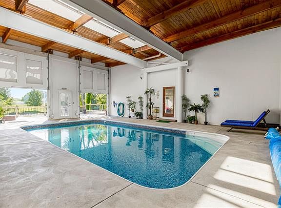 Vacation right at home at this stunning updated ranch home with 30 x 40 INDOOR pool room with access doors to party deck! Home is on a picturesque 1 1/2 acre lot with stocked pond! Great room features floor-to-ceiling fireplace, vaulted wood plank ceiling, wood beams, and stunning brick floor. Spacious formal dining for holiday meals!! Cook's dream kitchen with tons of upgrades. Vinyl plank floors, large center island with wood block countertops and veggie sink! Kitchen includes two dishwashers, double oven, and large farmhouse sink. breakfast area with bay window and bench seats with great view of pond. Spacious master suite walks out to the backyard pond with private bath and massive walk-in closet. Additional main level bedrooms are nicely sized, hall bath with shower/tub and double vanity. 2 additional half baths and large laundry room on the main floor. Lower level includes garage and partially finished area includes a gym and living/office area with built-in shelving, vinyl plank floors, and secret storage closet! Indoor pool includes skylights and large glass garage doors with access to back deck... the perfect setting for entertaining! Pool is 14x24. Fall in love with the natural views from your large, expanded deck!