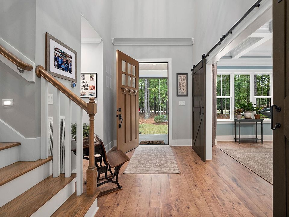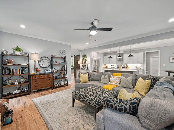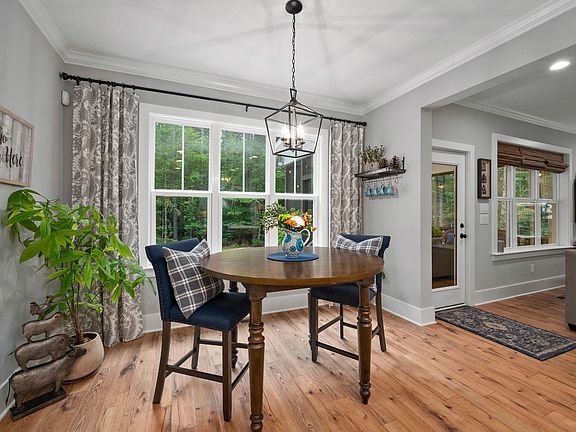 Custom Modern Farmhouse w/large front porch, back screened porch, grilling patio (Green Egg in cabinet stays!), hydrangeas galore & beautiful lawns sitting on 1.8 acres backing to woods. The main level features a two-story foyer, designer powder room, dining room w/ double barn doors, coffered ceiling & pocket door to the kitchen. The kitchen features quartz counter tops, soft-close cabinetry, large island & breakfast nook w/ a view of the peaceful back yard. The family room fireplace makes it a cozy spot w/ lots of windows & an abundance of natural light. Entering through the over-sized garage you'll walk directly into the mud room which features a double-door pantry & main level laundry just before entering the primary bedroom. This bedroom is stunning with a custom reclaimed wood accent wall, barn door to the luxury bath - granite countertops, dual vanities, stand-alone soaking tub and walk-in closet. On the second level are 3 additional bedrooms, 2 full baths, bonus room & unfinished storage room. This home is on a back country road, not in a traditional subdivision, making it far enough from it all to feel like a retreat, but close enough to everything you need for your convenience. A must see!