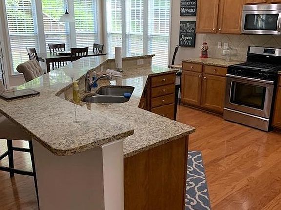 - Kitchen Features: Breakfast Bar, Cabinets Stain, Eat-in Kitchen, View to Family Room, Stone Counters