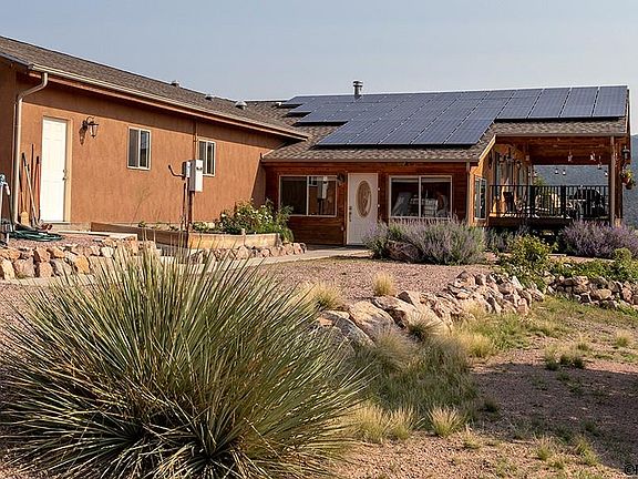 Price reduction! This majestic home epitomizes CO mountain living at its best. Solar tubes in almost every room & large windows bring in light & an eastern facing deck encourages sunrise appreciation as well as views of Cactus Mtn. & intriguing rock formations. Inside there is wood everywhere: solid pine doors; pine cathedral ceiling; cherry, maple, mahogany, & alder cabinetry. Included in the sale is a dry sauna in the 3 car garage & a solar heating system (panels & a battery backup) & a 20,000 watt Generac generator. For animal-oriented buyers, this property has a barn with a corral, expandable to 3 stalls w/Dutch doors, a feed room w/floor drain, all electrically lit. There is also a shop. Come appreciate this beautiful 3 bedroom home on 35 fenced acres of CO awesomeness!