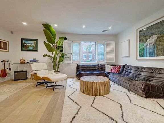 Rare opportunity! Suburban living with urban chic in the heart of Hoboken: this extra wide 25 x 100 stunning single family home with a massive landscaped yard (approx 1450 sq ft) has been stylishly renovated throughout. First floor: Entry with Moroccan tile and original pocket doors has stroller storage / mudroom / closet. Wide open, oversized living room / powder room with Moroccan tile / dining room with large picture window that showcases the huge yard / open kitchen with pantry. The stunning chef's kitchen has a coveted La Cornue stove dual fuel stove, Sub Zero 36" French door refrigerator, Viking wine refrigerator, Quartz Estatuario countertops, waterfall island and backsplash, custom kitchen cabinetry, open natural reclaimed wood kitchen shelves, farm sink with disposal and second sink, large pantry. Large slider doors lead to the bluestone patio and huge maintenance-free turf yard with custom cladded fence for privacy. Second floor has the main bedroom with private balcony, walk in closet and additional custom closets, and spacious en suite marble bath with double vanity, separate steam shower, and jacuzzi tub, framed by a large window; 2 additional family bedrooms and full bath. Third floor features a striking architectural 4th bedroom with reading nook, and 4 skylights. Lower level has a finished playroom and additional storage accessible from the yard & playroom. Wide plank light wood flooring throughout. New two zone HVAC connect to Nest thermostats. Full size LG laundry. Newly built interior railing and staircase. Handsome brick facade with boxwood planters. Includes one year rental parking nearby. Truly a spectacular suburban home with a private garden oasis centrally located in midtown Hoboken.