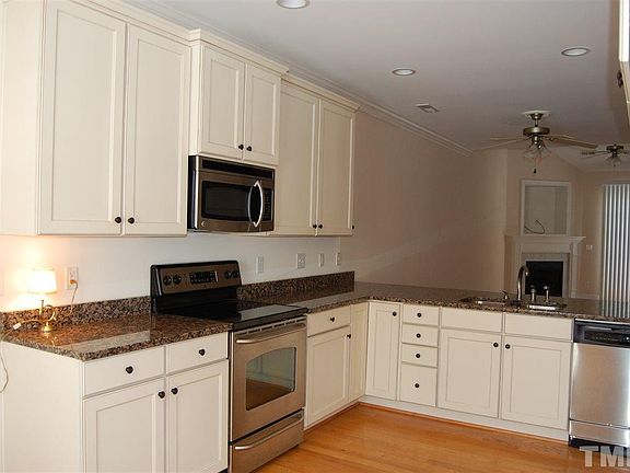 Beautiful, well-maintained townhouse with lots of upgrades. Close to downtown Wake Forest & shopping. Open floor plan with crown molding, gas log fireplace in living room, built-in bookcase, hardwood floors 1st floor and stairs. Kitchen features granite counter tops, SS appliances with eat-in area. Downstairs Master bedroom features trey ceiling, bamboo floors, Master Bath has custom subway tile in garden tub/shower and lots of storage. Built-in doggy door and privacy fence in backyard. Keyless entry.