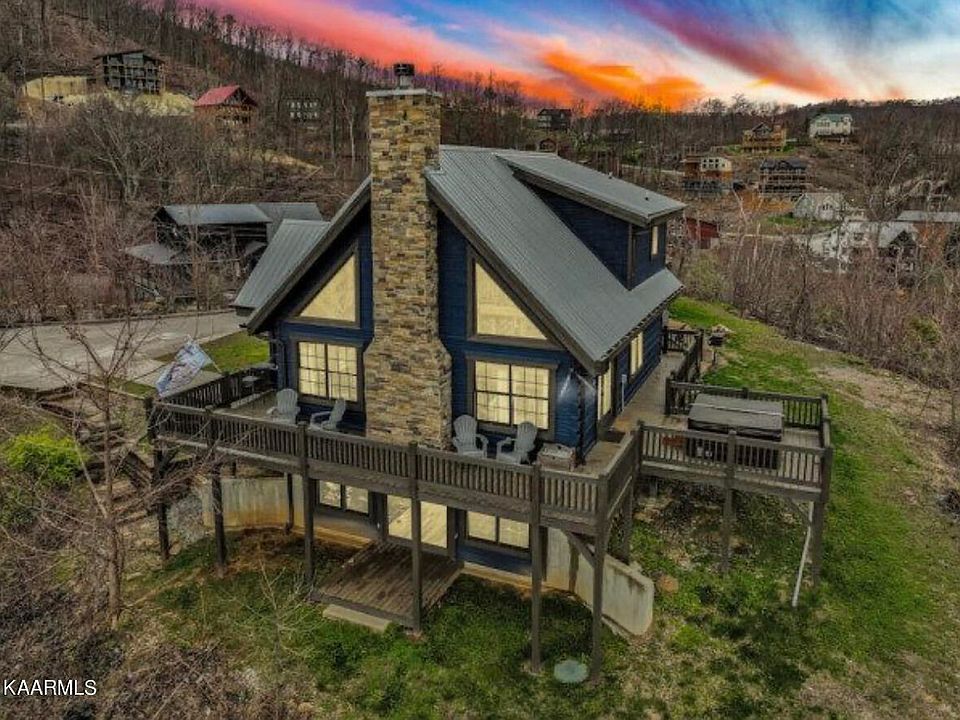 Luxury POOL log cabin in the heart of Gatlinburg, sitting in the center of Chalet Village N on a level lot with expansive mountain views. Renting as a 3 bedroom cabin/ sleeps 12. Recently a complete renovation and professional design/decor has been complete. From the moment you drive up and enter this beautiful cabin, the Mountains surround you. Outdoor entertaining area with new swimming pool 2022. Open great room, kitchen, dining and bedroom/bath on main. 2nd floor has bedroom & bath. Lower level features large game/family room, 3rd sleeping quarters/den, half bath and laundry room. Lower level walks out to patio with views. Great Smoky Mountains National Park is less than 1 mile, downtown Gatlinburg and Ober Mountain are just minutes drive. The Chalet Village Club offers pools, tennis and clubhouse. Drone photography used. Projected income $130,000. Creative financing options available.