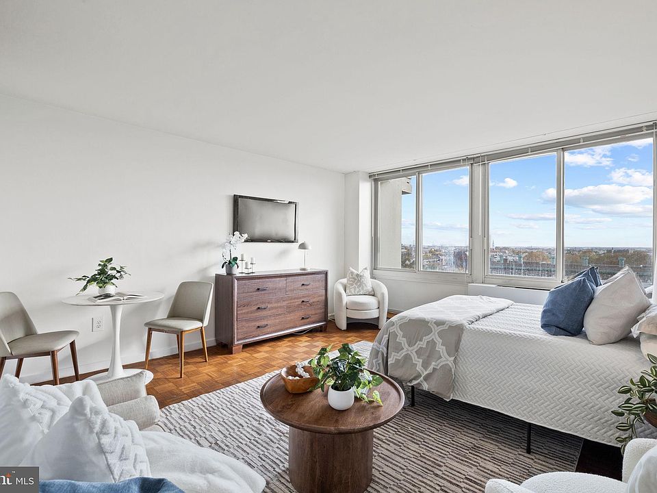 Sun-soaked studio with southern views at Hopkinson House on Washington Square! Enter through a foyer with large coat closet into the open great room beaming with natural light from oversized windows showcasing southern city views. Adjacent is the fully equipped kitchen with ample cabinetry and tile backsplash. There is a separate dressing area with excellent closet space that leads to the full bathroom boasting a tub shower with white tilework and a white tile floor. Additionally this home enjoys parquet wood floors and excellent storage space throughout. Residents of Hopkinson House enjoy a 24-hour doorman and on-site management. There is a seasonal rooftop pool with see-forever city views and valet parking in the building for an additional fee, subject to availability. Hopkinson House is in close proximity to many of the city's historic and cultural sites, some of the city's best shopping and dining and provides easy access to the Broad Street and Market Street office corridors, as well as 676, 95, Amtrak's 30th Street Station and the Philadelphia International Airport.