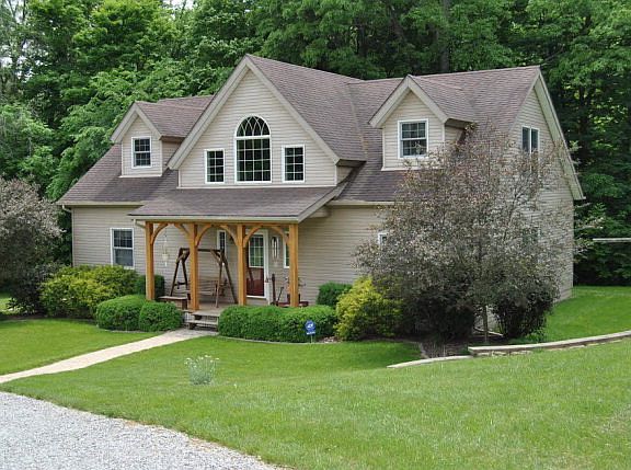 Timber frame, vinyl sided, breathtaking home - Just minutes to I-71. Beautiful 24' High open beam pine ceiling with white oak beams. Hrdwd floors throughout. All hickory kitchen cabinets. First floor master suite with claw foot tub and 4' walk-in shower. L shaped 4 seasons room overlooking beautiful woods and ravine. Open loft could easily be finished for 3rd bedroom. 30x24 concrete floor garage/shop - Heated & Insulated. Stream on lot. Frontage on 2 roads.