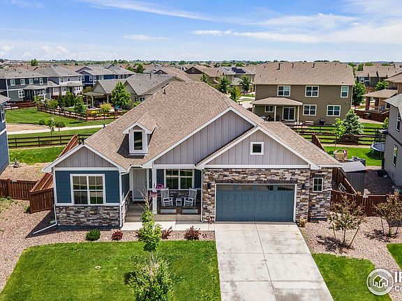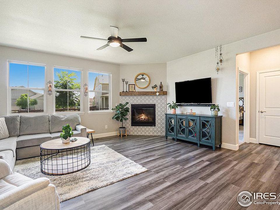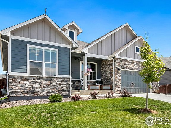 Enjoy upgraded features throughout this nearly new ranch-style home with three bedrooms plus office on the main floor, plus finished basement. More privacy than many homesites in this neighborhood with greenbelt behind and no direct backyard neighbor; there's a wide greenbelt and you can see the park from the back patio too! Huge garage is 630 sqft - plenty of room for cars and tons of built-in overhead storage. Best orientation in our Colorado climate facing west for easy snow melt on the driveway in the winter; early morning sun filters in great natural light from the east, and afternoon shade on the covered back patio is perfect to enjoy a cool beverage on a summer evening. The covered front porch is a wonderful place to enjoy watching the sunset over the mountains. Custom barn doors built from barn floor joists from an early 1900's local sugar beet farm can be closed to create a private guest suite on the main floor including both bedrooms and the bath - one could easily be a sitting area for separate living space from the main house; great potential for multi-generational living. Five-piece primary bath has a luxurious shower and spacious walk-in closet. The kitchen will thrill any buyer looking for abundant cabinetry and a spacious pantry. The great room holds large furniture for easy relaxing in front of the gorgeous custom tile fireplace with reclaimed wood mantel from a late 1800's Timnath barn. Large dedicated office space on the main floor is suitable for working from home while enjoying front range views. Finished basement with enhanced insulation between the main floor and the basement for sound mitigation also has plenty of unfinished space for great storage. The 4th bedroom space is currently home to workout equipment that could be included in the sale. Rec room has more than enough space for game tables, pool & movie viewing area. Another walk-in closet in the basement offers plenty of storage space for gear. Home warranty included!