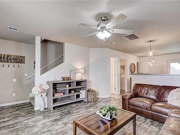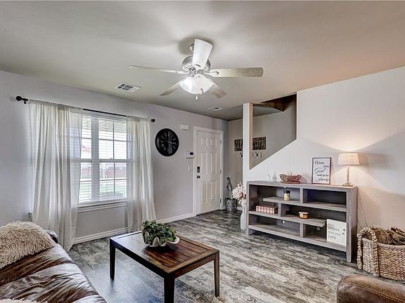 WOW! This house is CUTE AS A BUTTON! Check out the curb appeal on this updated, well maintain, move in ready home located at the top of a culdesac. Great open floor plan with new modern flooring throughout living, dining, and kitchen space. The large eat in kitchen has modern lighting, loads of counter space, nice cabinets and a large pantry. Laundry room and half bath downstairs. All bedrooms and 2 more bathrooms are up. Large master has en suite bath and HUGE master closet! 3rd bedroom is a flex room that could be bedroom, office, or second living space. Alarm system, covered patio, and bonus outdoor deck with privacy fence. Conveniently located to I-35 and 15 min to Tinker.