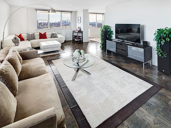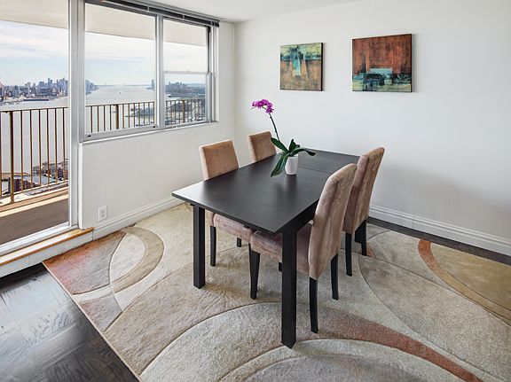 Rare and spacious renovated 3 bed/2 bath corner unit w/expansive Manhattan skyline view fr GWB and Hudson River N.&S. in luxury hi-rise full amenity bldg. Open concept w/oversized LR. Gourmet kit w/SS appliances, granite counters and Sub Zero frig. MBR suite features custom closets make this unit a find! Dining Rm opens to 300 sq.ft. terrace for outdoor entertaining. 24 hr. concierge, pool, gym, storage & NYC bus at doorstep. Maint. incl. util. & taxes. Penthouse feel without Manhattan prices. Welcome home!