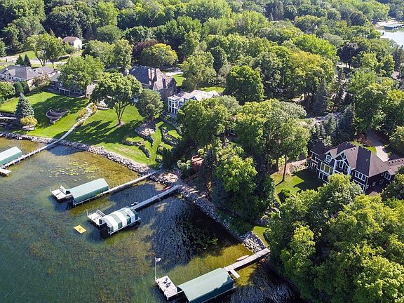 Lake Minnetonka Lakeshore! Stonewood-built coastal cottage with miles of big water views and sandy shoreline. Open design with floor-to-ceiling windows across the entire lake side of home. Great room with fireplace opens to center-island kitchen with Wolf, Sub-Zero and granite. Exceptional finishes throughout including hardwood floors, enameled millwork detail and custom cabinetry. Large ironwood deck overlooking lawn and lake. Stunning screen porch with vaulted ceiling and stone fireplace. Four bedrooms on the second floor including the primary bedroom with lakeside balcony, luxury bath, large walk-in closet, and upper-level laundry room. Entertain in style in the lower-level family room with fireplace, wet bar, billiards, and dedicated golf simulator room. Walk out to professionally landscaped lawn and inviting lakefront space. Close to Lake Minnetonka Regional Park and award-winning Westonka Schools.