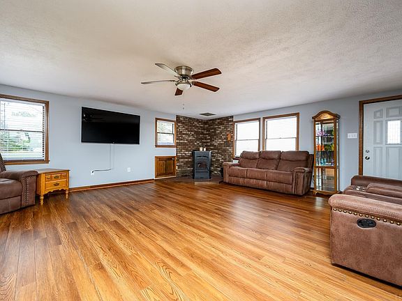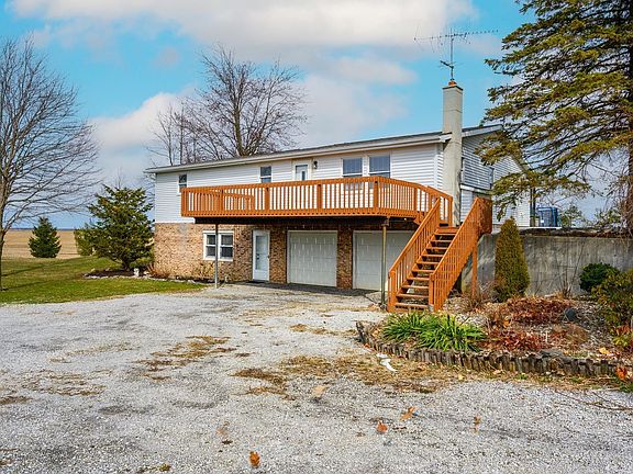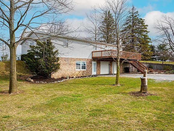 Sitting on two and a half acres, this cozy home features a second story front deck, spacious living room with pellet stove and new flooring, open eat-in kitchen with floating breakfast bar, convenient laundry area with pull down access to attic. Main bedroom ensuite with walk-in closet, XL jacuzzi tub, and separate standup shower. Basement family room is perfect for unwinding, and screened-in three seasons room is a highlight; offering a ceiling fan and backyard access. Enjoy the oversized backyard and new patio, as well as two large sheds providing ample storage space. Fresh paint, new blinds throughout, 220 electrical for hot tub in 3 seasons room, 360 view of sunrise and sunset with mature trees, 500 gallon rented propane tank, and recently repaved country road close to Stoy Farms. Be sure to check out the 3D tour!