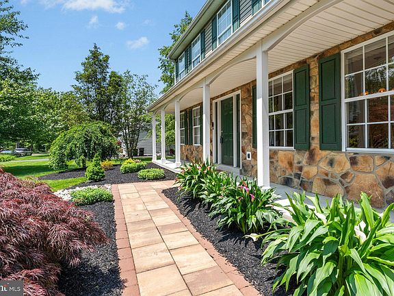 Welcome to this stunning Center Hall Colonial, nestled on a premium lot with exceptional curb appeal and a charming rocking chair front porch. This lovingly maintained home offers classic elegance, modern upgrades, and abundant space inside and out. Step inside to a gracious foyer flanked by formal living and dining rooms—ideal for entertaining. The remodeled kitchen is a chef’s dream, featuring Quartz countertops, stainless steel appliances, a center island, gas cooking, a butler’s pantry, a walk-in pantry, and a sunny breakfast room with beautiful views of the backyard. The adjacent family room offers a bright and relaxing space with large windows that fill the room with natural light. A tiled laundry/mud room includes built-in cabinetry and convenient access to both the oversized 2½-car garage and the fully fenced rear yard. Outdoors, enjoy multiple patios, lush landscaping, and ample space for recreation and entertaining. The expanded driveway offers plenty of parking, including room for recreational vehicles. Upstairs, the spacious primary suite features a cathedral ceiling, a walk-in closet, a linen closet, and a spa-like ensuite bath with a corner soaking tub, double vanity, and separate shower. Three additional bedrooms share a well-appointed hall bath with double vanity and tile finishes. Additional highlights include a full basement, replacement exterior doors and insulated garage door, a Timberline 30-year roof, a security system, and many more thoughtful updates. Plumstead township is a hidden gem in Bucks County, close to everything and yet tucked away to provide the peace and privacy you value. The quaint and historic towns of New Hope and Doylestown are nearby with wonderful restaurants and entertainment venues. This is a rare opportunity to own a truly turnkey home on a beautiful lot in the coveted Central Bucks School District—schedule your private showing today!